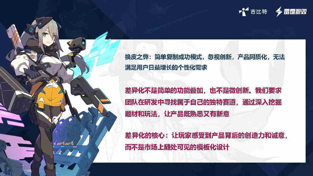 在我们内部是这么定义差异化的。。。首先,,,,差异化不是简单的功能叠加,,,,更不是换皮。。只是换皮,,,,产品无法提供有效的市场价值。。。内部经常说差异化的产品不是为了迎合市场,,而是找到一个自己独特的表达方式,,在研发中找到属于自己的细分赛道和独特赛道,,前提是需要对这个题材有足够的深入、、挖掘,,对玩法有足够深入的理解,,,让产品看起来既熟悉又有新意。。。